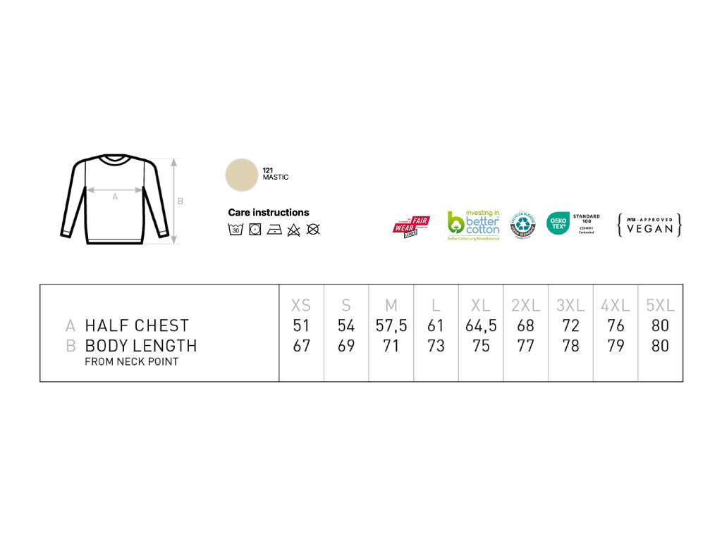 True gender-neutral style with side seams. Classic modern relaxed fit for all occasions. Soft handfeel. Set-in sleeves with a slight dropped shoulder enhance mobility. Classic cuffs and bottom hem in 1x1 rib with elastane.