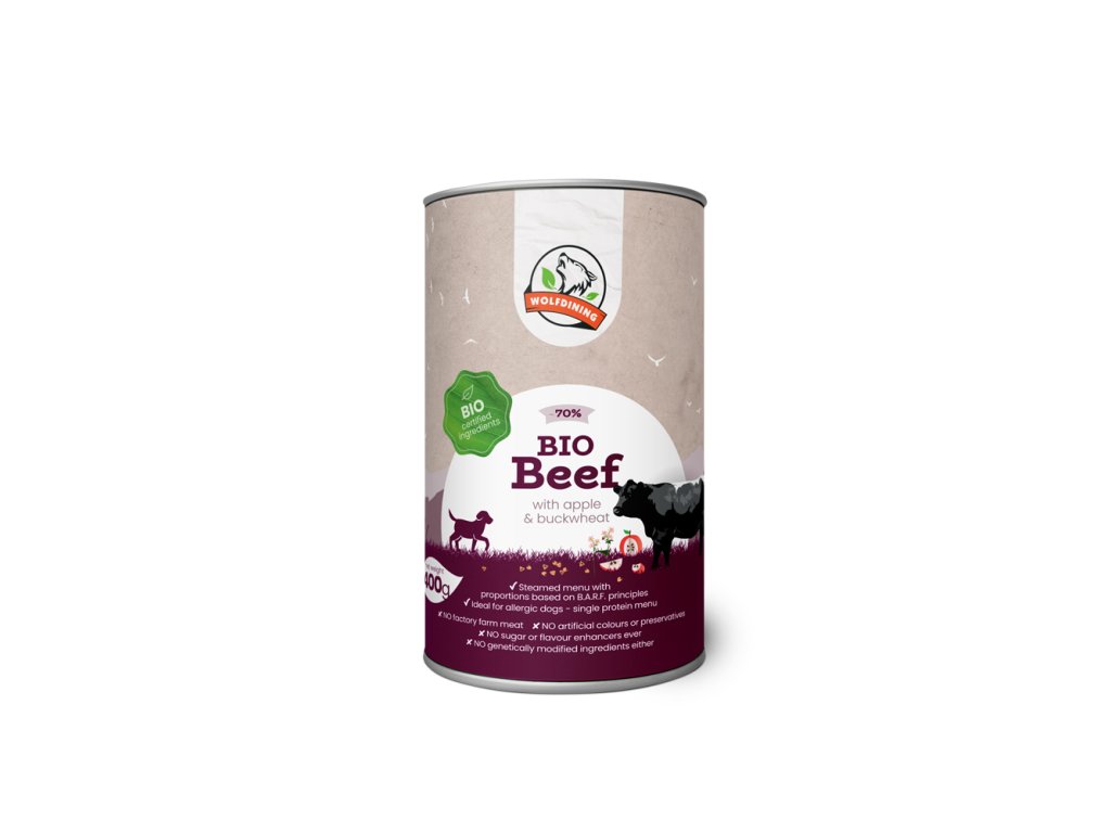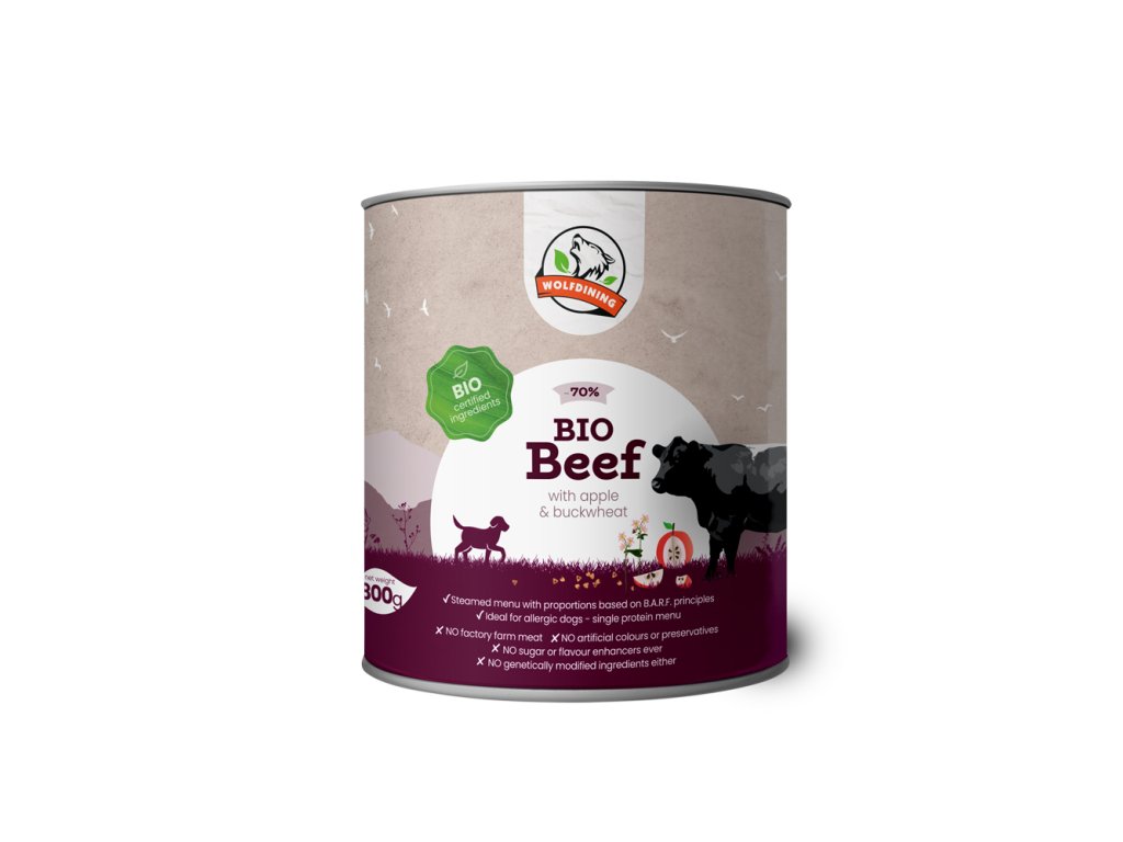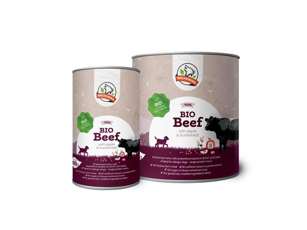 Zloženie: 70,15 % bio hovädzie mäso (mäso, srdce, pľúca, pečeň), 19,5 % bio jablko, 8 % bio pohánka, 0,5 % bio hruška, 0,5 % bio ľanový olej, 0,3 % Lithothamnium calcareum (červené riasy), 0,05 % bio Ascophyllum nodos (hnedé riasy)